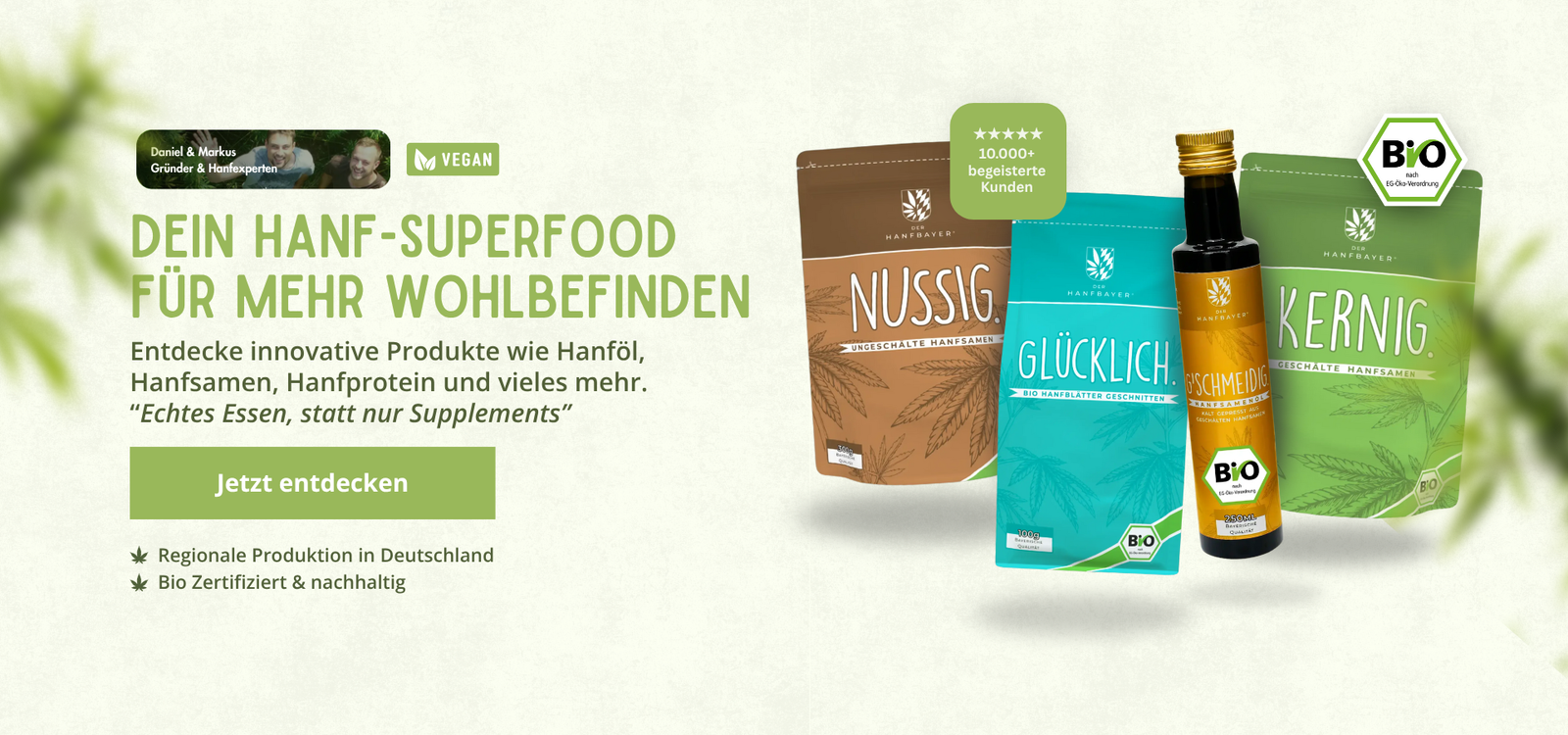 Unsere Vision ist es, dir langfristig noch mehr gesunde Superfoods anzubieten. Heute legen wir unseren Fokus auf Hanföl, Hanftee, Hanfsamen, Schwarzkümmelöl und Hanfprotein – die Herzstücke unseres Angebots.