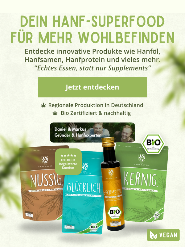Schon vor Jahrtausenden nutzten Kulturen die Kraft der Hanfpflanze – von nahrhaften Hanfsamen bis zu aromatischem Hanftee. Heute wissen wir mehr denn je, wie wertvoll diese naturbelassenen Lebensmittel sind. Genau hier setzt Hanfbayer an: Wir bieten dir eine sorgfältige Auswahl an hochwertigen Hanfprodukten, die perfekt zu deinem gesunden Lifestyle passen.